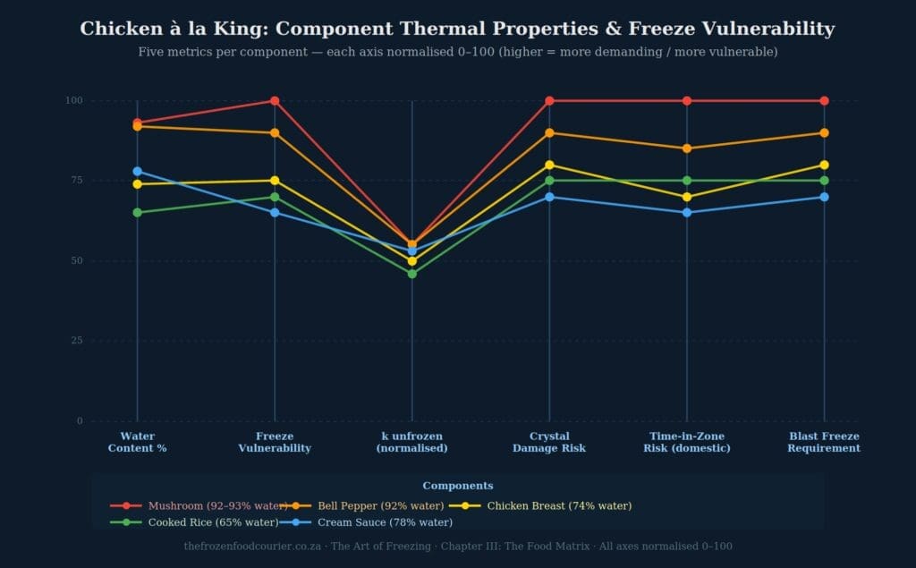 Chicken à la king over rice combines two independent thermal systems with entirely different freeze behaviours in a single container. The chicken and sauce component requires rapid freezing to protect protein structure and emulsion stability. The rice component requires rapid freezing to prevent retrogradation. The mushroom component — if present — is the most vulnerable ingredient of all and requires the fastest freezing speed to survive intact. No single protocol can optimally serve all three simultaneously. The question is which compromise degrades the result least.