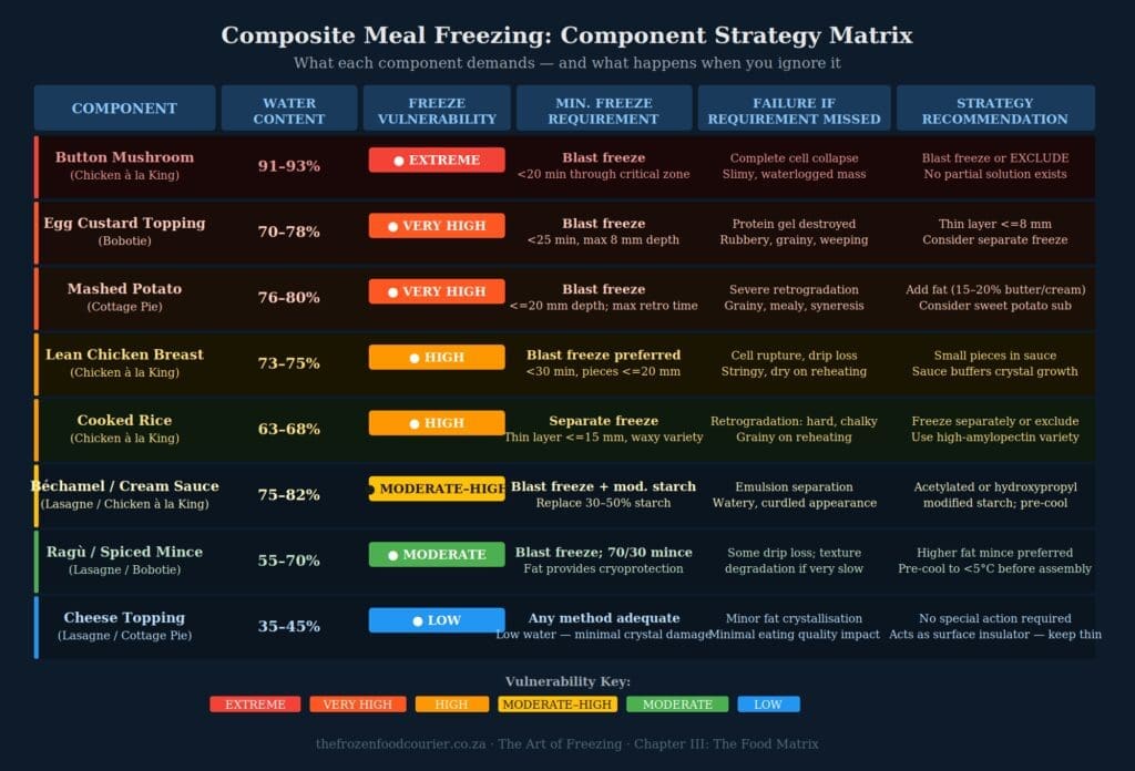 The custard topping of a bobotie therefore sets the freezing speed requirement — not the meat filling below it, which is relatively well protected by its fat content. A protocol adequate for the meat is inadequate for the custard.