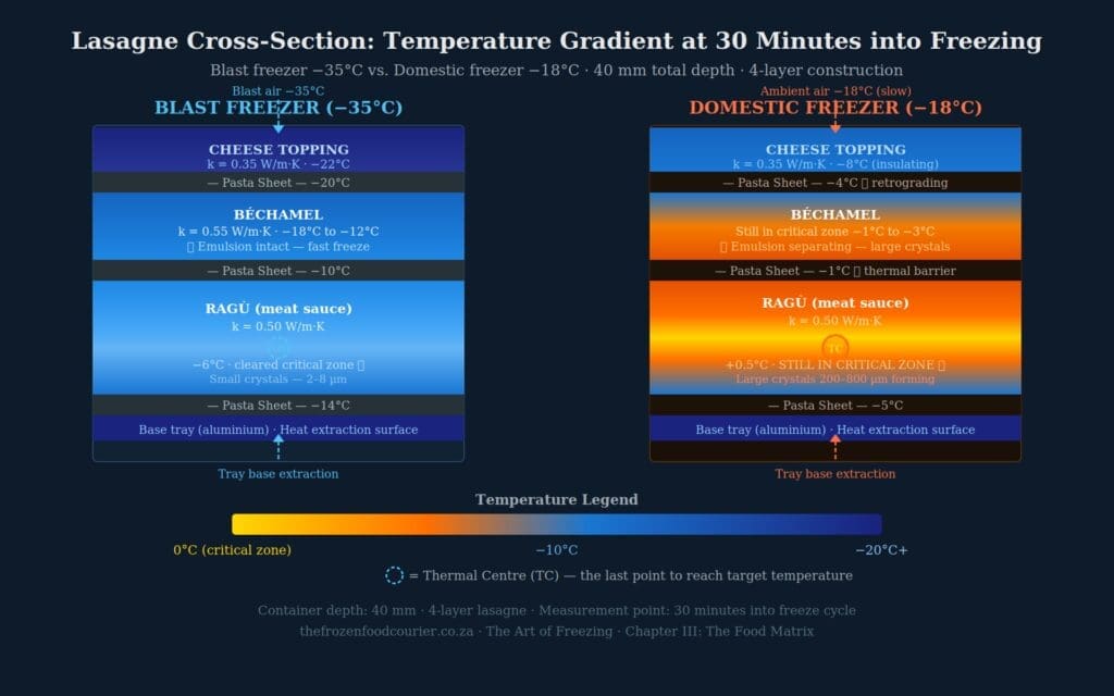 Third, freezing points differ across components. In a lasagne, the béchamel begins transitioning to solid at around −0.5°C (high free water, few dissolved solutes). The ragù, with its fat content and dissolved proteins, begins at approximately −1.5°C to −2°C. The pasta layers begin at around −1°C. These differences mean the meal is never uniformly “in the critical zone” — different layers pass through it at different times, making the concept of a single freezing curve inadequate. You need to track the slowest component, because that component is the one experiencing extended time in the critical zone and forming the largest crystals.