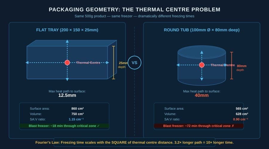 The flat tray’s SA:V ratio of 1.15 cm⁻¹ versus the round tub’s 0.90 cm⁻¹ looks like a 28% difference. But because freezing time scales with distance squared, the thermal centre difference of 12.5mm versus 40mm translates to a freezing time ratio of (40/12.5)² = 10.24×. A tenfold difference in freezing performance from a packaging decision made without consulting a single physics equation.