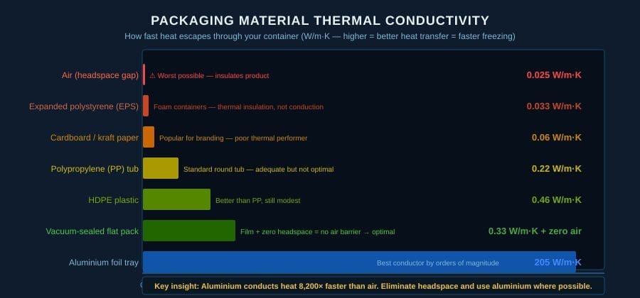 Your packaging is not passive. It is an active participant in the thermodynamics of freezing — defining the maximum distance heat must travel, controlling the conductivity of the path it travels, and determining whether air gaps insulate your product from the cold you paid to generate.