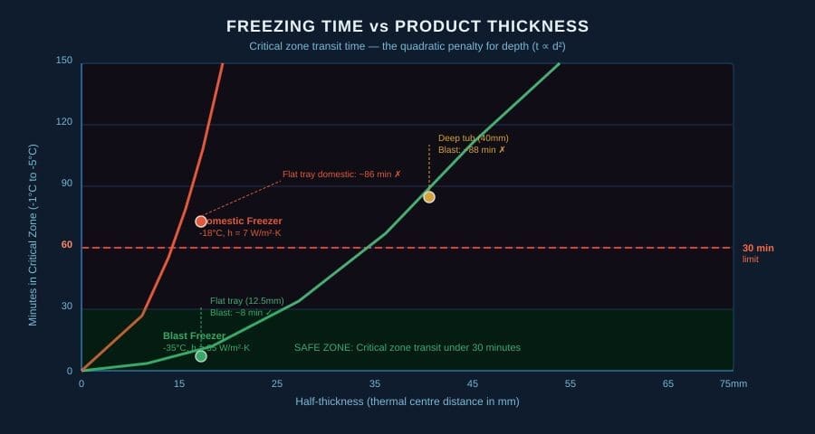 The 30mm threshold for blast freezer performance is important. It means that any container deeper than 60mm total (30mm from lid to centre plus 30mm from centre to base) requires either a deeper temperature, higher air velocity, or longer residence time to achieve acceptable critical zone transit. Many South African producers are selling 1kg deep containers frozen in blast freezers set to -35°C and wondering why their product quality is inconsistent. The physics has been providing the answer all along.