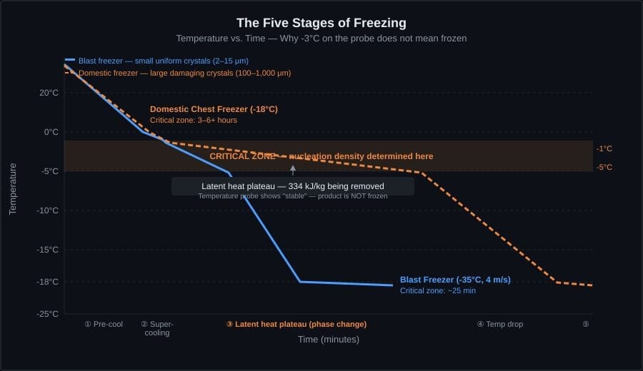 Freezing is not a temperature threshold. It is a process with five distinct stages: pre-cooling, supercooling, nucleation, phase-change plateau, and deep freeze completion. A product at -3°C on your blast cell probe may be simultaneously solid on the surface, inside the latent heat plateau through its middle layer, and still liquid at its core.