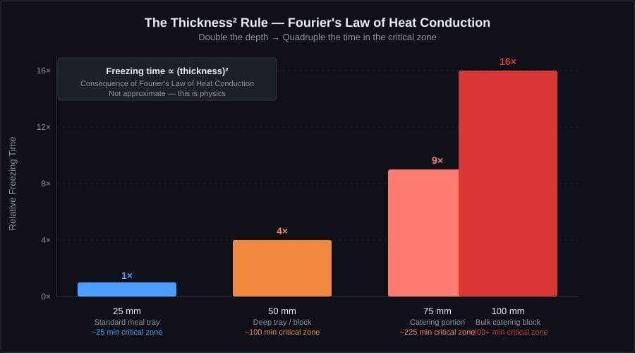 This is why the packaging geometry arguments from Chapter V have direct production implications. A producer who has optimised packaging for shelf space or portion size without accounting for thermal geometry has made a freezing quality decision without knowing it. The physics does not distinguish between accidental and deliberate choices.