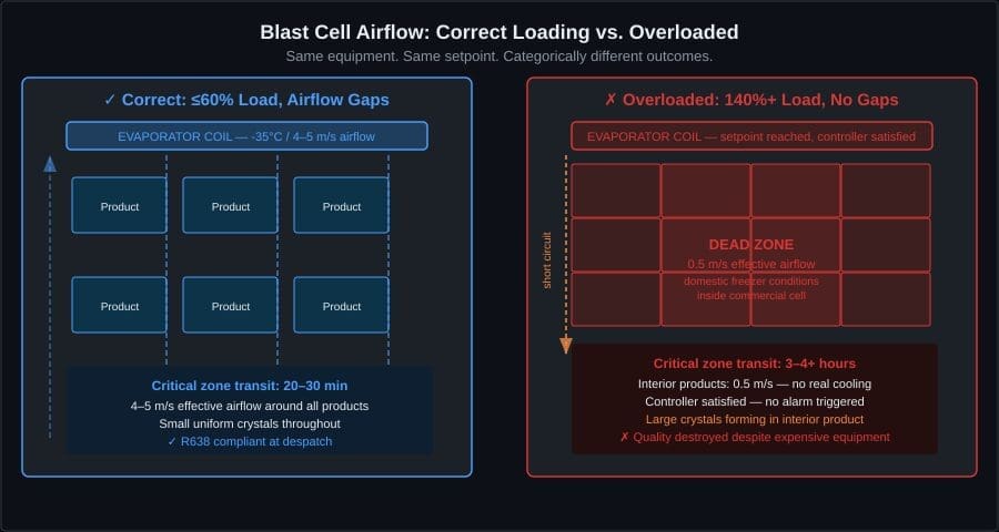 Blast freezing depends on forced convection — high-velocity cold air stripping heat from product surfaces. Overloading reduces effective airflow velocity around individual products. The blast freezer still reaches its setpoint temperature, which means the controller is satisfied and no alarm triggers. But the product in the interior of a dense load stack experiences effective airflow of 0.5 m/s instead of 4 m/s. That is domestic freezer conditions inside a commercial blast cell.