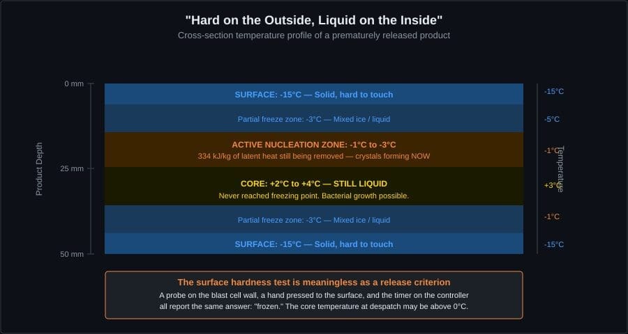 The key insight is what the latent heat plateau looks like to production staff. The temperature probe shows a stable reading. The timer says the product has been in the blast cell for an hour. They assume it is frozen. It is not. The probe is measuring air temperature or surface temperature, not core temperature. The product is still consuming 334 kJ/kg of latent heat — physically invisible on any standard readout.
