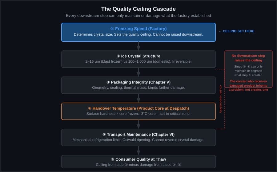 A product blast-frozen correctly, handed over at -18°C core temperature, and transported in a vehicle that drifts to -12°C during a multi-stop route will arrive in better condition than a product slow-frozen in a domestic freezer, handed over at -3°C surface temperature, and transported at perfect -18°C throughout. This is not an opinion about commercial practices. It is a consequence of the LSW rate equation, Fourier’s law, and the thermodynamics of Ostwald ripening. You can read the full physics in our Technical Formulas Reference.